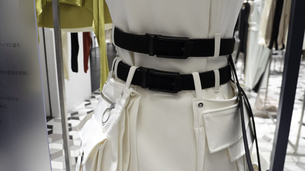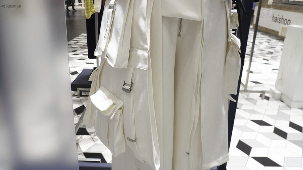 三吉さん:例えば、多層階のイメージは洋服のレイヤー(重ね着)で表現されています。また、文化のカオス感や、小さなコミュニティがたくさん存在する様子は、機能的でありながらデザインのアクセントにもなっている数多くのポケットで表現されています。これらはベルトに装着されているので、取り外せばシンプルなワンピースとしても着用でき、より未来的なシルエットを楽しめます。