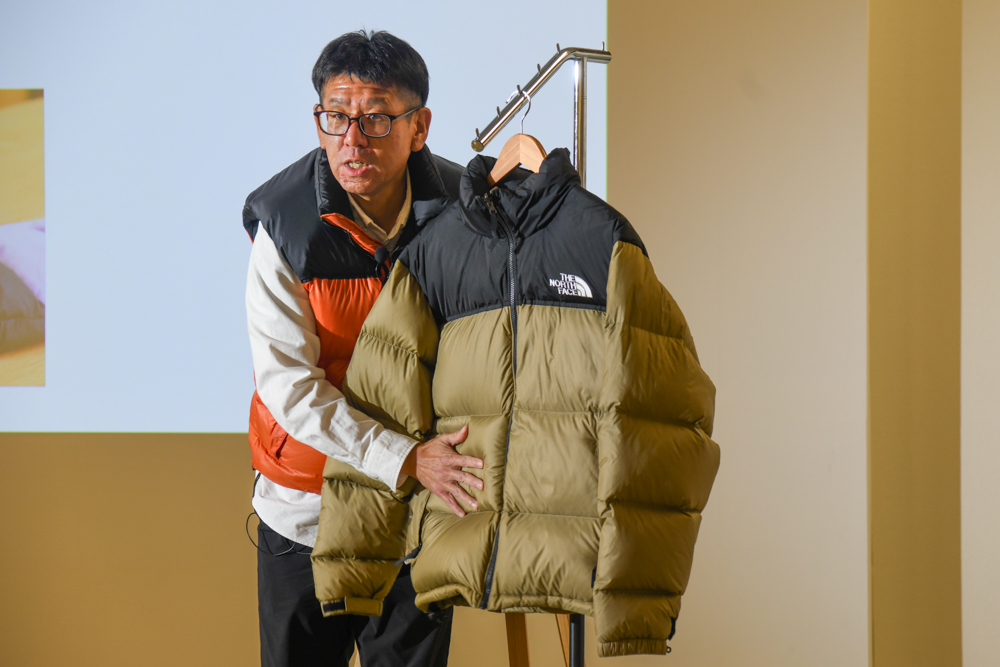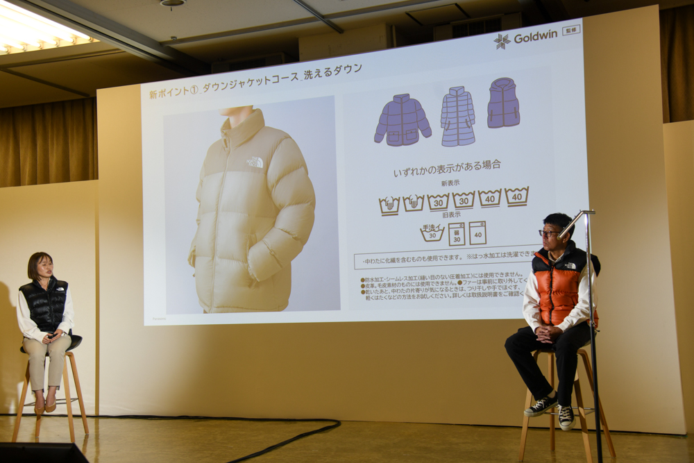 五明氏とともに登壇したゴールドウイン開発本部テックラボの柴田氏は、始めにダウンジャケットの洗い方を指南。ダウンジャケットを手洗いする際のポイントは「中わたが片寄らないようにやさしく洗い、綺麗な水でくりかえしすすぐこと」だとし、具体的なコツとして「①やさしく、まんべんなく全体を洗うこと」「②すずきを十分に行うこと」「乾燥途中に中わたをほぐすこと」の3点が紹介された。