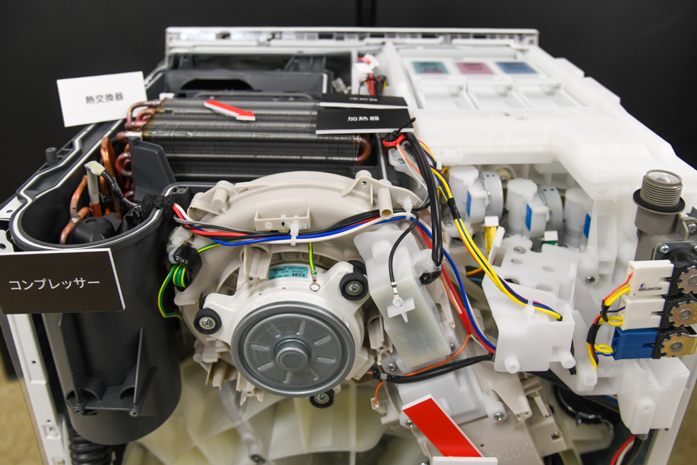 会場では、新機種のその他の進化ポイントとして「従来モデル比で消費電力量約10%削減」「汚れはがし剤対象コースの拡大」の紹介があったほか、プレゼン後には、同社製品に搭載されているコア技術の仕組みを知る見学ツアーも実施。「スゴ落ち泡洗浄」の要で、洗剤液を泡立ててドラム層内に送り込む「泡生成ボックス」と泡水を循環させる「循環ポンプ」。機体上部に設置することで風の循環効率を高めたヒートポンプユニットや低振動設計の重要部である「流体バランサー」の内部が実物とともに紹介され、リーディングカンパニーならではの技術力の高さを実感することができた。