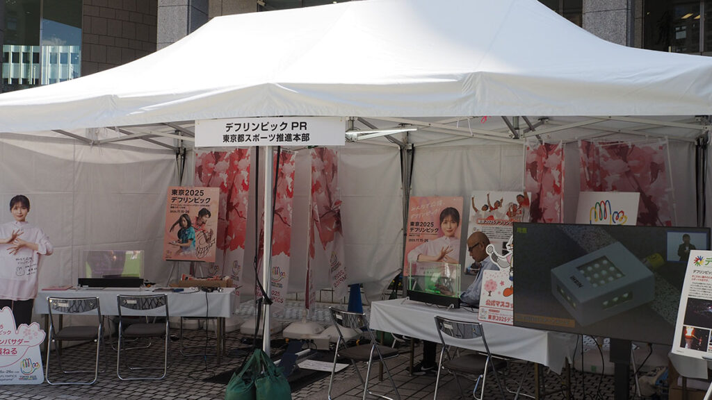 2025年に東京で開催される聴覚障がい者のための国際スポーツ大会「デフリンピック」のPRブース。デジタル技術を活用した情報保障の取り組みなども紹介されています。