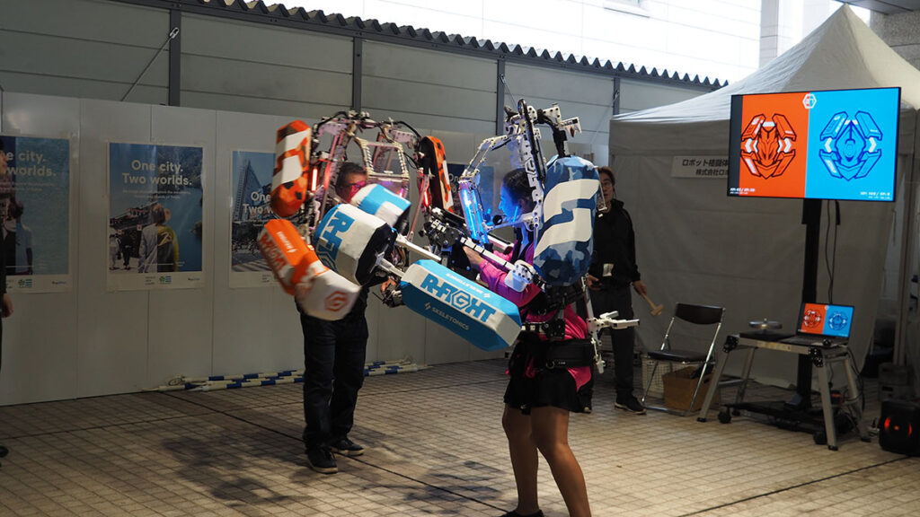 人がロボットを装着して戦う、新感覚のテクノスポーツ。センサーが打撃を判定し、まるで格闘ゲームの世界に入り込んだかのような熱いバトルが繰り広げられていました。