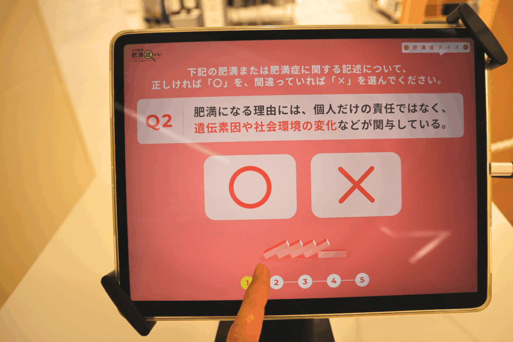 「肥満」と「肥満症」の区別がわかりづらいため、会場奥には、両者の違いが楽しく学べる学習コンテンツが用意されており、クイズに答えることで理解を深めることができる工夫がなされていました。