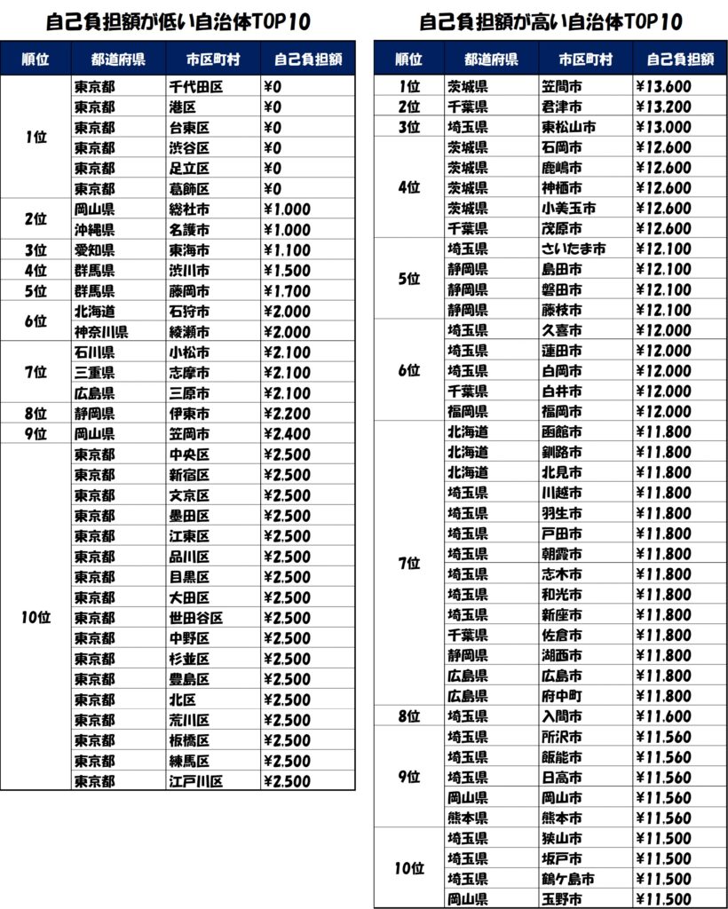 最も低い自治体:東京都千代田区・港区など6区(0円・無償)