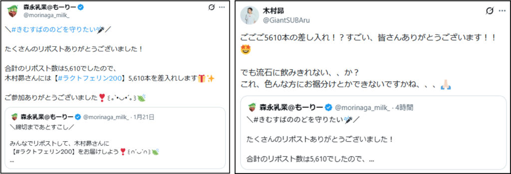 森永乳業がX(旧Twitter)上で展開した「#きむすばののどを守りたい」キャンペーンは、声優・俳優として幅広く活躍する木村昴さんの“のど”を気遣う呼びかけからスタートしました。ファンが参加できる差し入れ企画として実施されたこの試みには、想定を大きく上回る反響が寄せられ、集まった「森永ラクトフェリン200ドリンクタイプ」は5,610本にものぼったといいます。しかし、この企画が印象的だったのは数字の大きさだけではありません。差し入れが集まりすぎたことに対し、木村さん自身が「これは自分だけでなく、みんなにも届けたい」と発信したことをきっかけに、企画は新たな展開を迎えます。SNS上の共感が、リアルな場での“おすそわけ”へとつながった今回の取り組み。その背景には、のどを大切にするというシンプルでありながら、多くの人が共感できるテーマがありました。