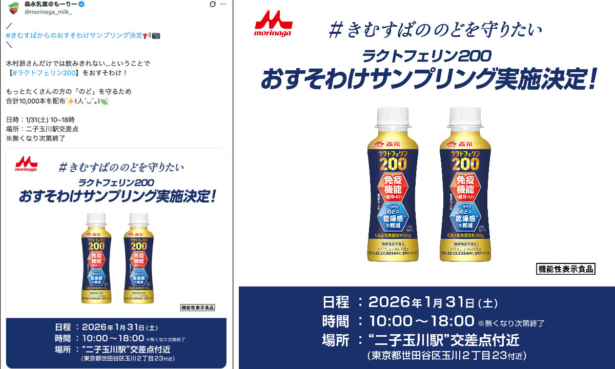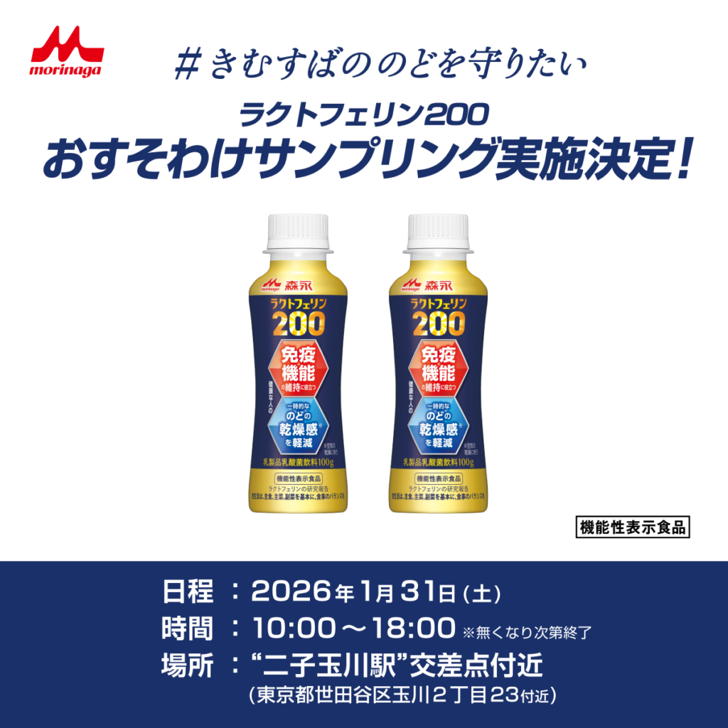 こうした流れを受けて決定したのが、東京都・二子玉川駅周辺での街頭サンプリングです。当日は「森永ラクトフェリン200ドリンクタイプ」10,000本が配布される予定とされています。