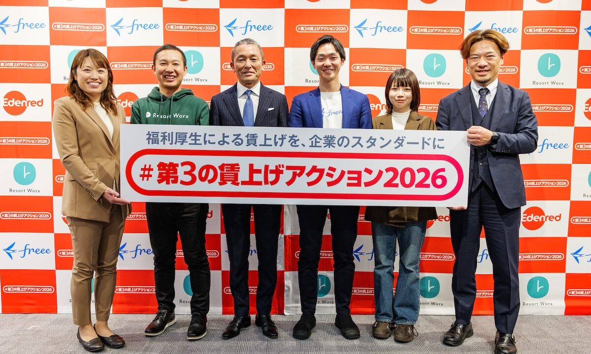 「#第3の賃上げアクション2026」では、賛同企業であるエデンレッドジャパン、freee、リゾートワークスの3社の福利厚生サービスを期間限定で無料または半額で提供するほか、地域限定キャンペーンの「地域グロースアクション」を北海道・仙台・福岡で実施するとのこと。