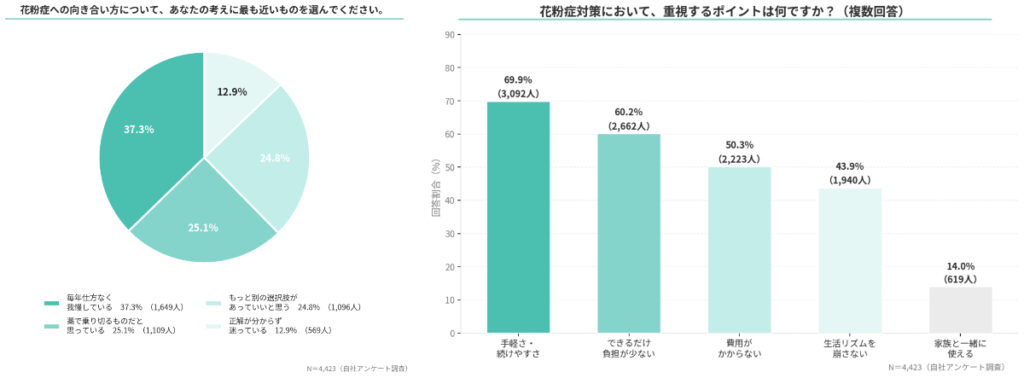 これまで花粉症対策といえば、薬で症状を抑えるという方法が主流でした。しかし今回の調査からは、「薬は必要だけれど、できれば頼りすぎたくない」と感じている人が多いことが見えてきました。花粉症は毎年繰り返されるものだからこそ、できるだけ無理なく付き合っていきたい――。そんな思いから、薬以外の方法を模索する人も増えているのかもしれません。