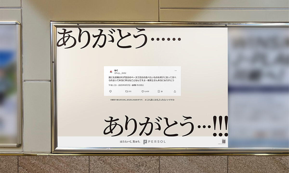 2026年3月、別れと旅立ちの季節である「卒園シーズン」に合わせ、同プロジェクトが新たな一歩を踏み出した。駅中や駅近に保育園がある全国24箇所の駅に、保護者から寄せられた切実な感謝を綴った“お礼広告”を掲出。今日もどこかで子どもを見守る保育関係者へ、真っ直ぐな想いを届けていく。
